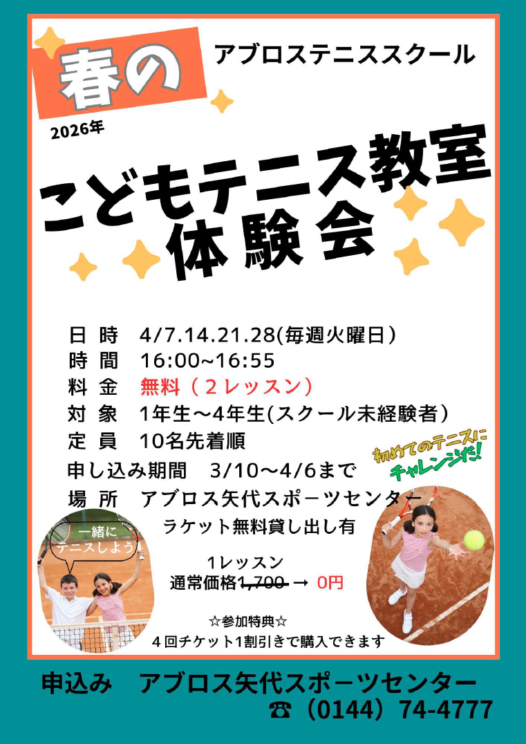 こどもテニス教室体験会開催 / アブロス矢代スポーツセンター