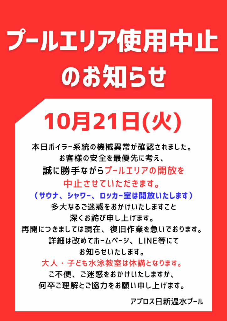 【重要!】10/21(火)プールエリア使用中止のお知らせ