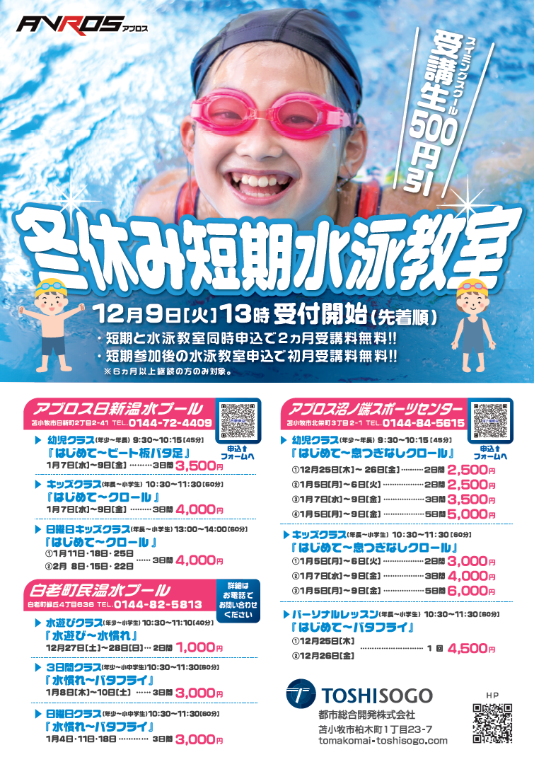 2026年1月7日(水)より冬季短期水泳教室を開催いたします!今回は3コースをご用意いたしました!