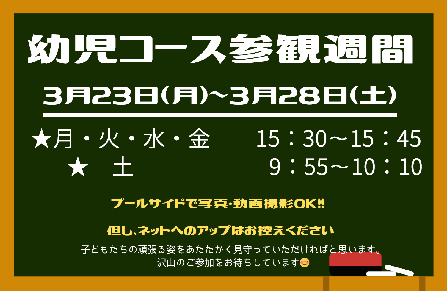 この度、幼児水泳教室におきまして日頃の練習の様子をご覧いただける参観日を開催いたします。