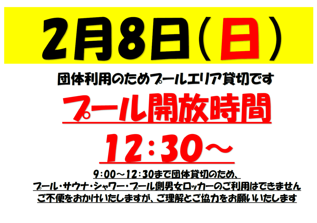 2月8日(日)は団体による貸切となるため一般のプール利用は12:30からとなります。(※1月28日開放時間訂正)